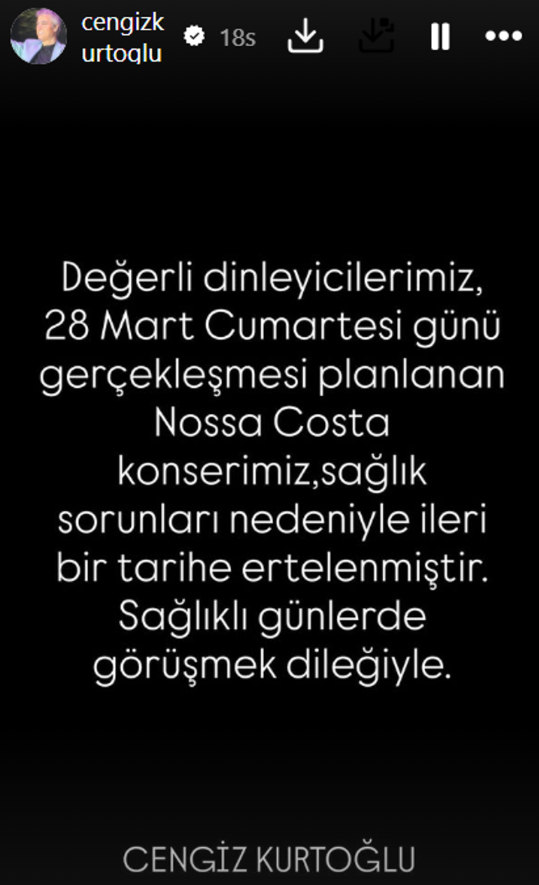 Kurtoğlu, dün akşam sosyal medya hesabından yaptığı açıklama ile Cumartesi günü yapılacak olan konserini ertelediğini duyurdu: