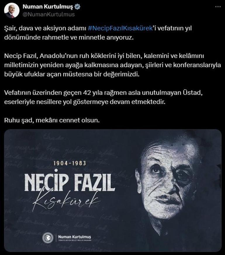 "Şair, dava ve aksiyon adamı Necip Fazıl Kısakürek'i vefatının yıl dönümünde rahmetle ve minnetle anıyoruz. Necip Fazıl, Anadolu'nun ruh köklerini iyi bilen, kalemini ve kelamını milletimizin yeniden ayağa kalkmasına adayan, şiirleri ve konferanslarıyla büyük ufuklar açan müstesna bir değerimizdi. Vefatının üzerinden geçen 42 yıla rağmen asla unutulmayan Üstad, eserleriyle nesillere yol göstermeye devam etmektedir. Ruhu şad, mekanı cennet olsun."