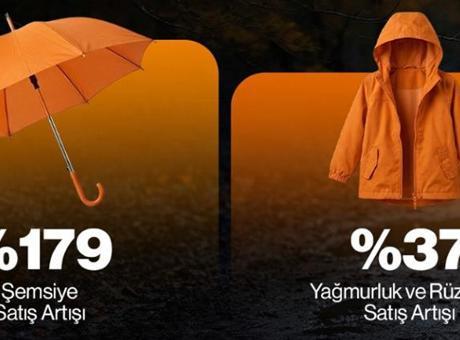 Bu dönemde en dikkat çekici artış, şemsiye kategorisinde yaşandı. Şemsiye satışları, yüzde 179’luk yükselişle hızlı büyüyen kategori oldu. Yağmurluk ve rüzgarlık kategorisinde faaliyet gösteren satıcıların satışlarının ise yüzde 37 arttığı açıklandı.