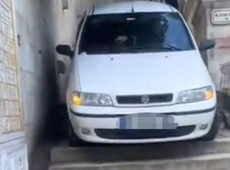 Görüntüde, merdivenleri kullanarak aracıyla belirli bir yere kadar gelen sürücünün, otomobilinin sinyallerini yakarak merdivenlerden inmeye çalışması yer aldı.